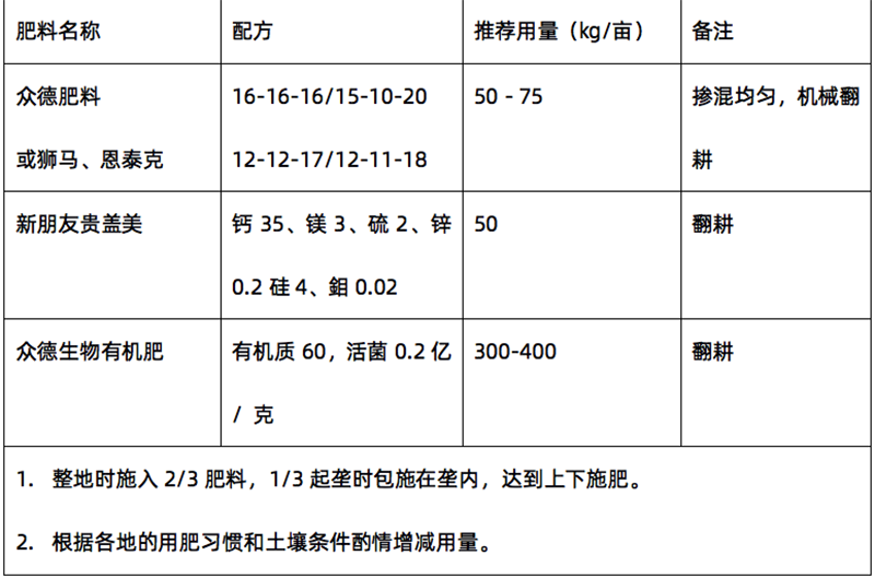 ?。?)推薦施肥套餐(根據(jù)目標(biāo)產(chǎn)量、地域、品種、地力等適當(dāng)調(diào)整)